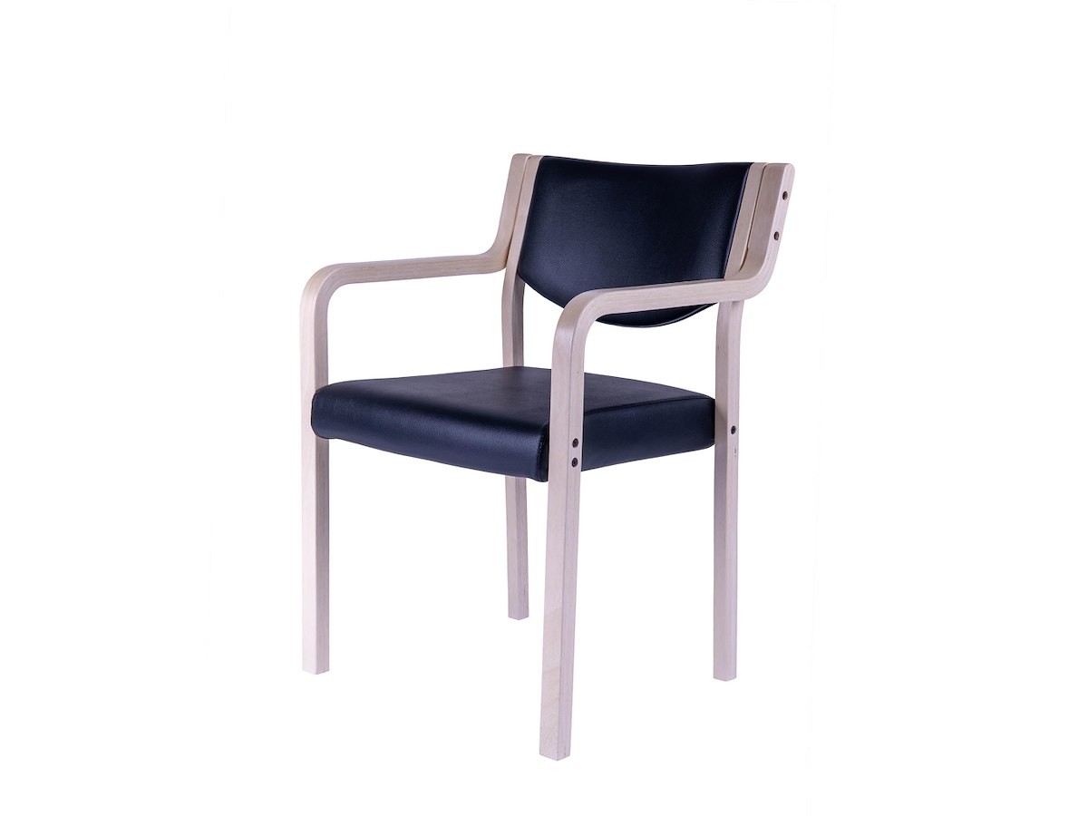 En rigtig solid stol i massivt lyst træ, der matcher både birk og ahorn. Stolen står også rigtigt flot til de lidt mørkere trætyper, som f.eks bøg og eg. Stolen er polstret med kraftigt sort kunstlæder på både sæde og ryg, der tåler aftørring. Og det formstøbte sæde øger både siddekomforten, og sædets holdbarhed. Scandic Q kan stables 6 stykker af gange.