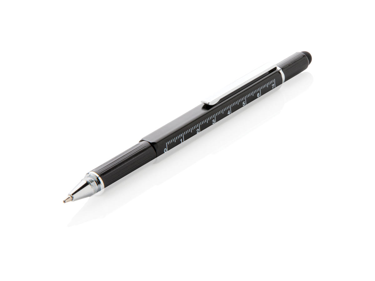 Multifunktions pen med lineal (7cm), vaterpas, skruetrækker, stylus og ballpoint med blå blæk (op til 400m). Lavet af kvalitets messing samt aluminium clip.