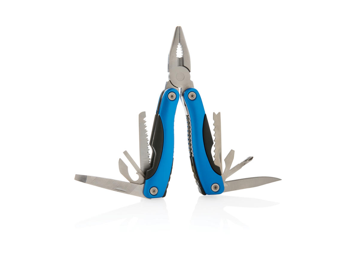 Aluminiumsmultiværktøj, håndtag med sorte detaljer, 14 funktioner, pakket i et sort 600D-etui.