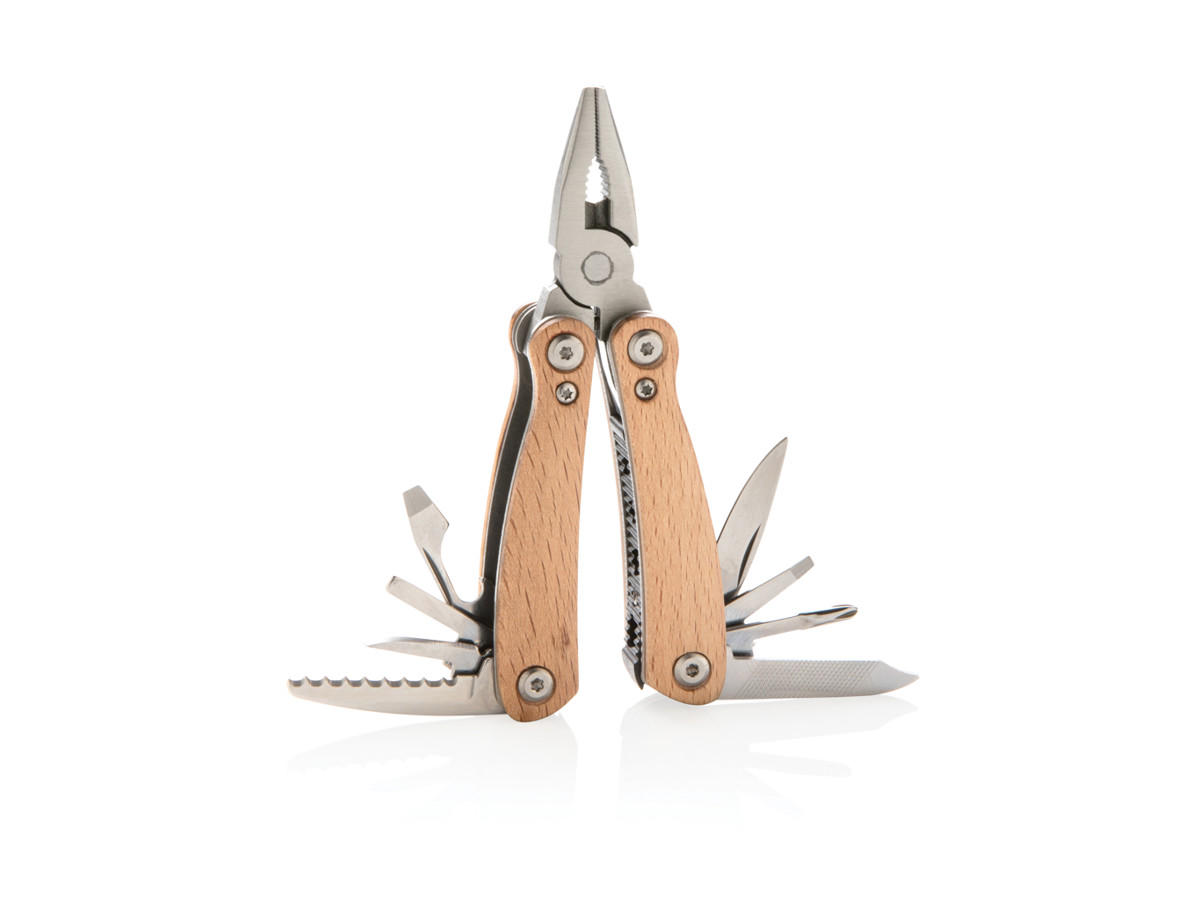 Kompakt og holdbart multiværktøj med 12 funktioner. Fremstillet af bøgetræ og med værktøjer af rustfrit stål i høj kvalitet. Inkluderede værktøjer: spidstang, standardtang, ledningsskærere, savtakket klinge, lille kniv, mellemstor flad skruetrækker, oplukker, stor flad skruetrækker, kniv, lille flad skruetrækker, Phillips skruetrækker, fil og renser. Pakket i gaveæske.