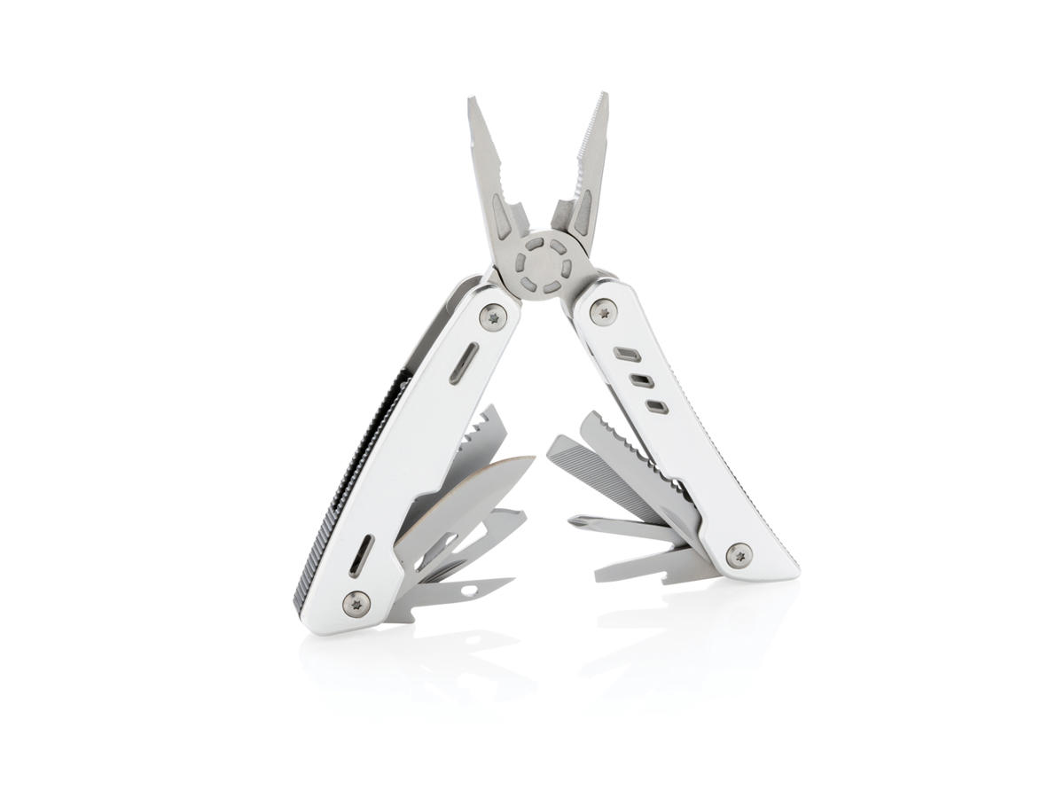 Stærkt og holdbart multiværktøj med 12 funktioner. Fremstillet af aluminium og med værktøj i rustfrit stål. Inkluderede værktøjer: spidstang, almindelig tang, ledningsskærer, kniv, phillips skruetrækker, lille flad skruetrækker, sav, dåseåbner, oplukker, savtakket kniv, syl med nåleøje, fil og stor flad skruetrækker. Pakket i gaveæske.