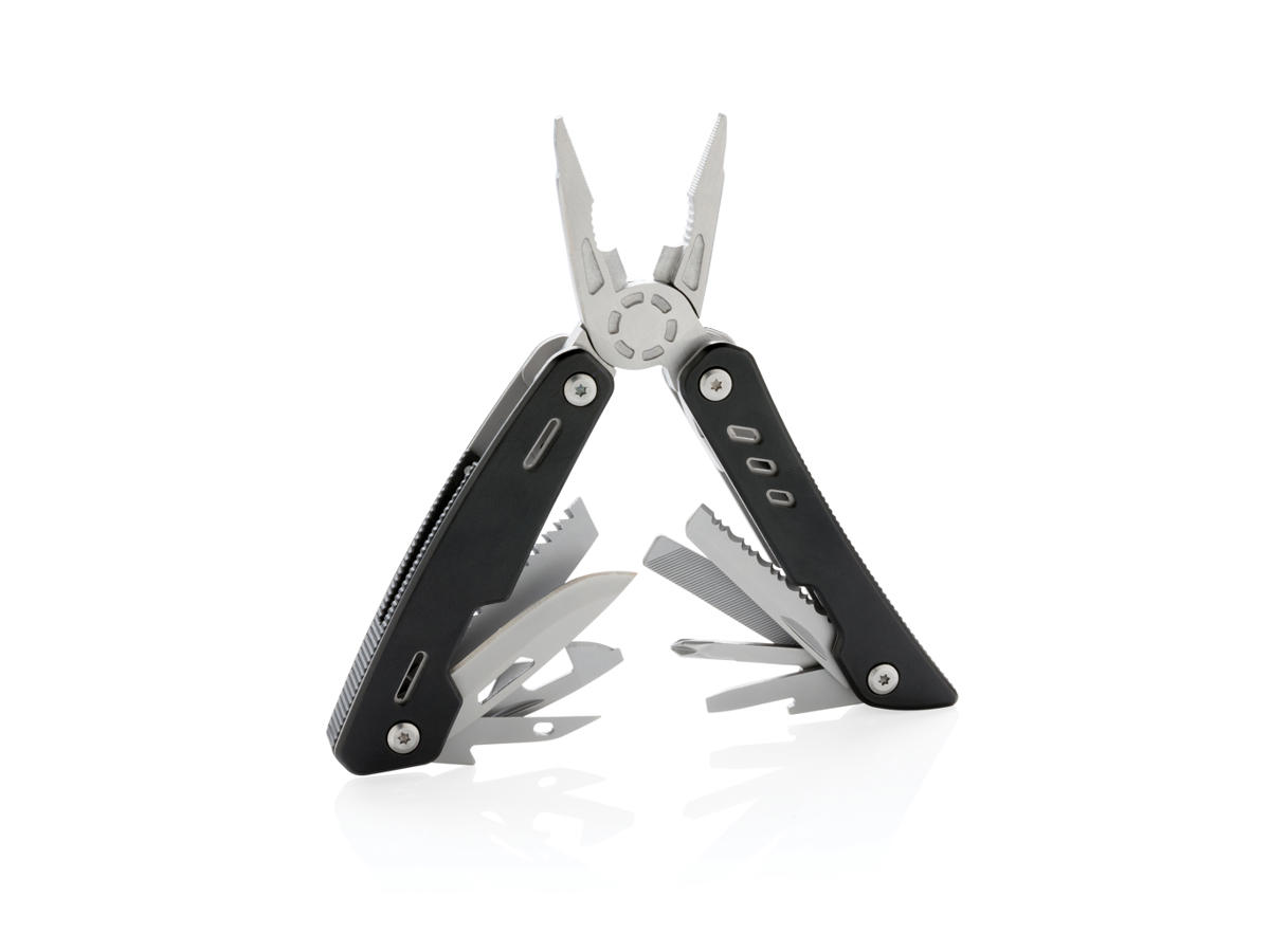 Stærkt og holdbart multiværktøj med 12 funktioner. Fremstillet af aluminium og med værktøj i rustfrit stål. Inkluderede værktøjer: spidstang, almindelig tang, ledningsskærer, kniv, phillips skruetrækker, lille flad skruetrækker, sav, dåseåbner, oplukker, savtakket kniv, syl med nåleøje, fil og stor flad skruetrækker. Pakket i gaveæske.