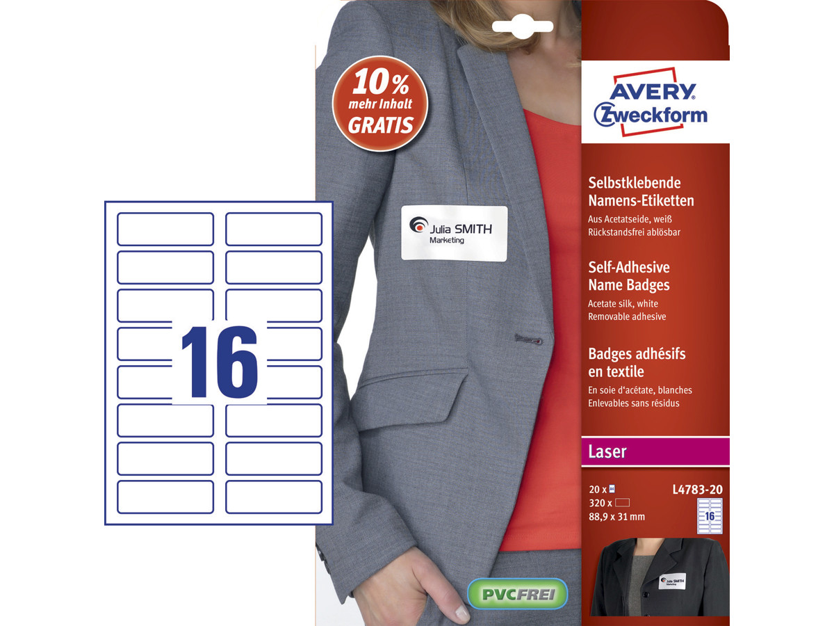 Avery L4783 navneskilte er fremstillet i et eksklusivt PVC-frit silkemateriale, som giver et elegant og professionelt look. Navneskiltet kan klæbe på alle tekstiler, men er også let at fjerne igen uden at efterlade mærker på tøjet.