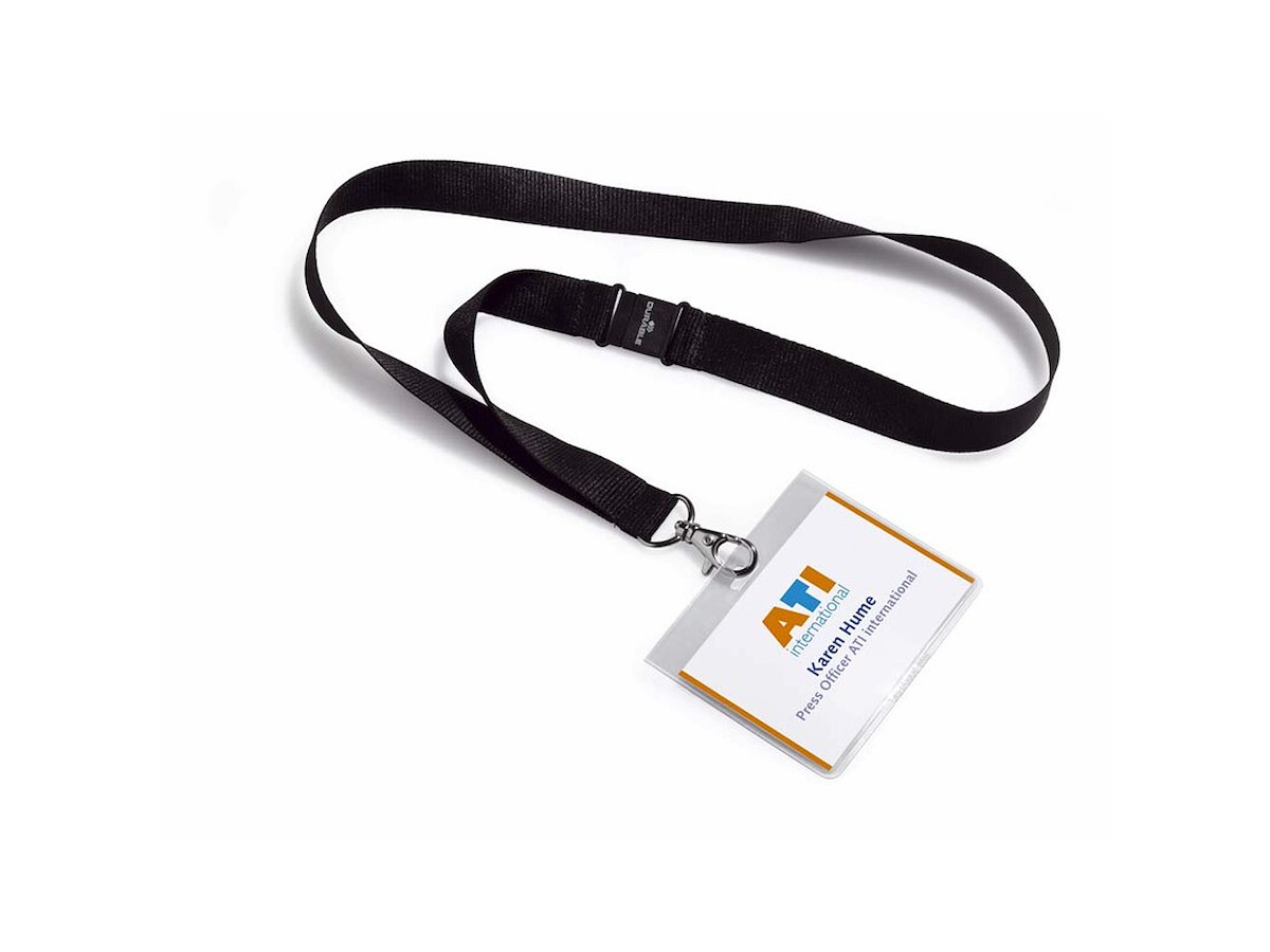 Navneskilt i tværformat med 20mm bred halssnor at vedhæftede og derved forsegler lommen. Halssnor med sikkerhed udgivelse, der åbner, hvis halssnoren bliver fanget. Længde 44 cm. Indstik medfølger. Mål indstik: 60x90mm (HxB).