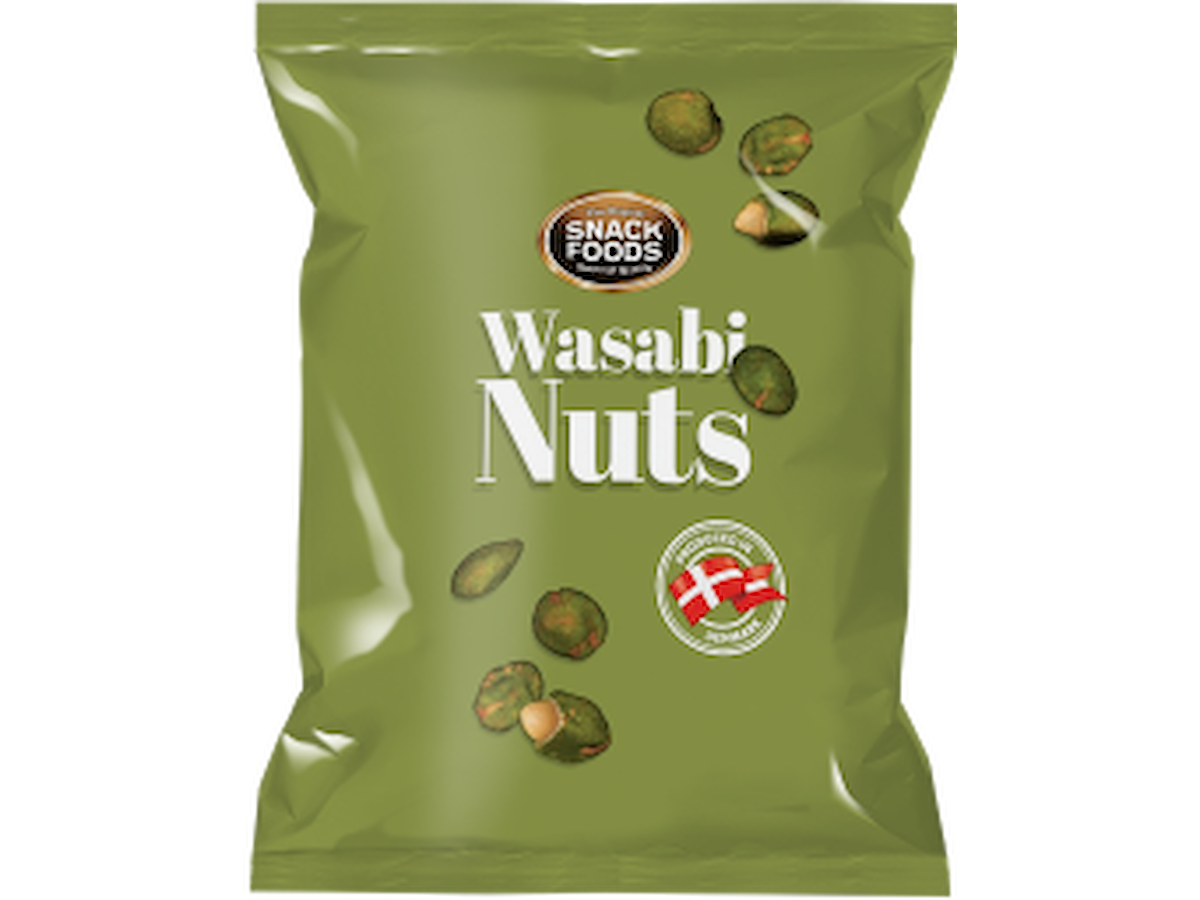 Ingredienser: 27% PEANUTS, HVEDEMEL, sukker, majsstivelse, majsmel, palmeolie, salt, SOYABØNNE, dextrin, koji, farvestof (E150c, E141), kartoffelstivelse, maltodextrin, aroma, syre (E330), antioxidant (E392), 0,003% wasabi. KAN INDEHOLDE SPOR AF: FISK, MÆLK, NØDDER, SELLERI, SESAM,