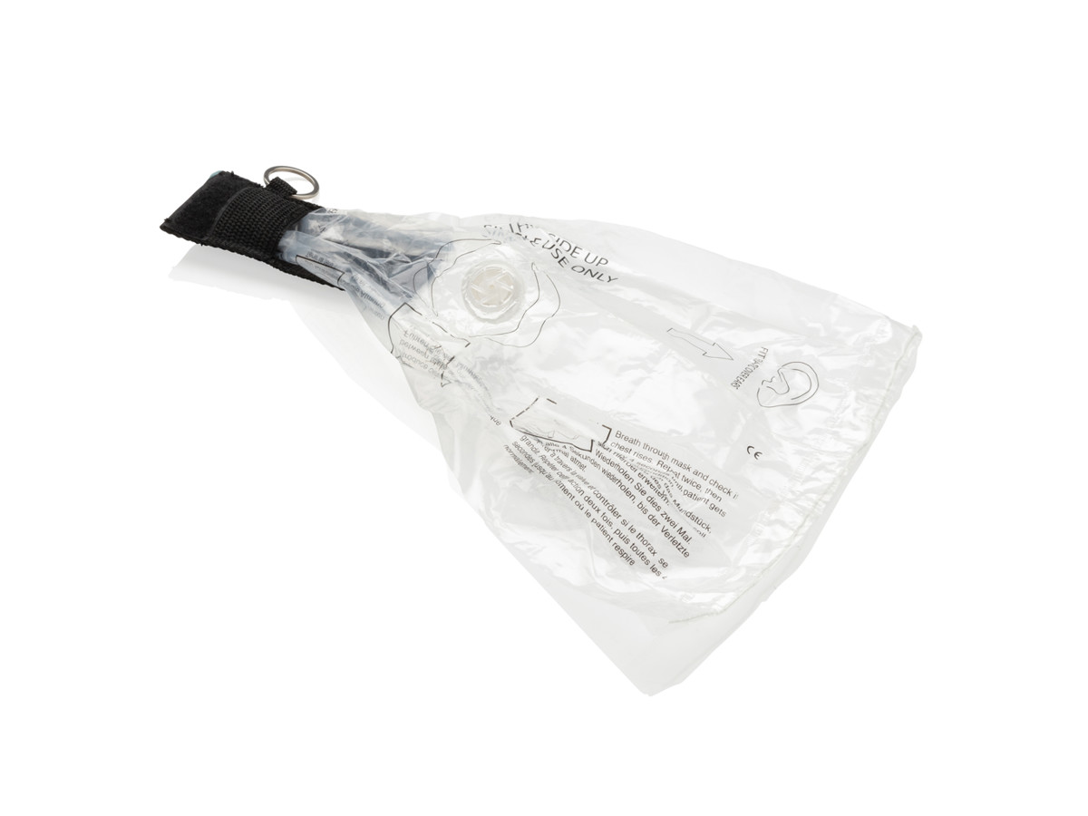 Lille førstehjælpspung i rød webbing med hvid logoklap, rød Velcro nederst, 1cm sort webbing i venstre side med 2,5cm nøglering i hærdet stål, inklusive mund-til-mund-maske der overholder EN 13485:2003.