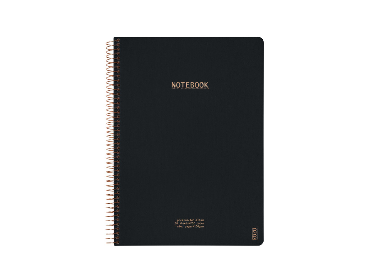 KOZO Premium Notesbog er absolut en af de flotteste notesbøger på markedet. Det kraftige lærreds omslag med smukke detaljer i bronze og den kraftige topspiral, også i bronze, gør at den er perfekt at skrive og notere i, både når du har den liggende på knæet eller endda stående uden at have støtte. Og selvfølgelig en smuk indretningsdetalje til dit skrivebord. Det giver en luksuriøs følelse at skrive på det cremefarvede 100 g. papir. Samtlige sider i notesbogen har en datolinie øverst til højre, enkelt og praktisk. Matcher med alle andre KOZO skrivebordsartikler i samme farvenuancer.