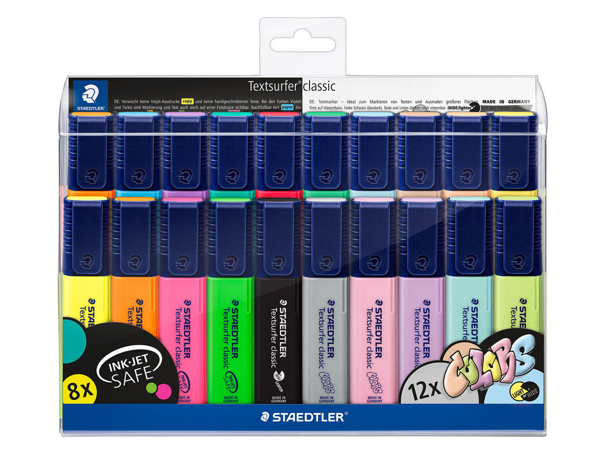 STAEDTLER Textsurfer Classic indeholder alle 20 farver fra Textsurfer serien, hvilket giver en bred vifte af muligheder for at gøre dine dokumenter, noter og præsentationer mere overbevisende og organisatoriske.
