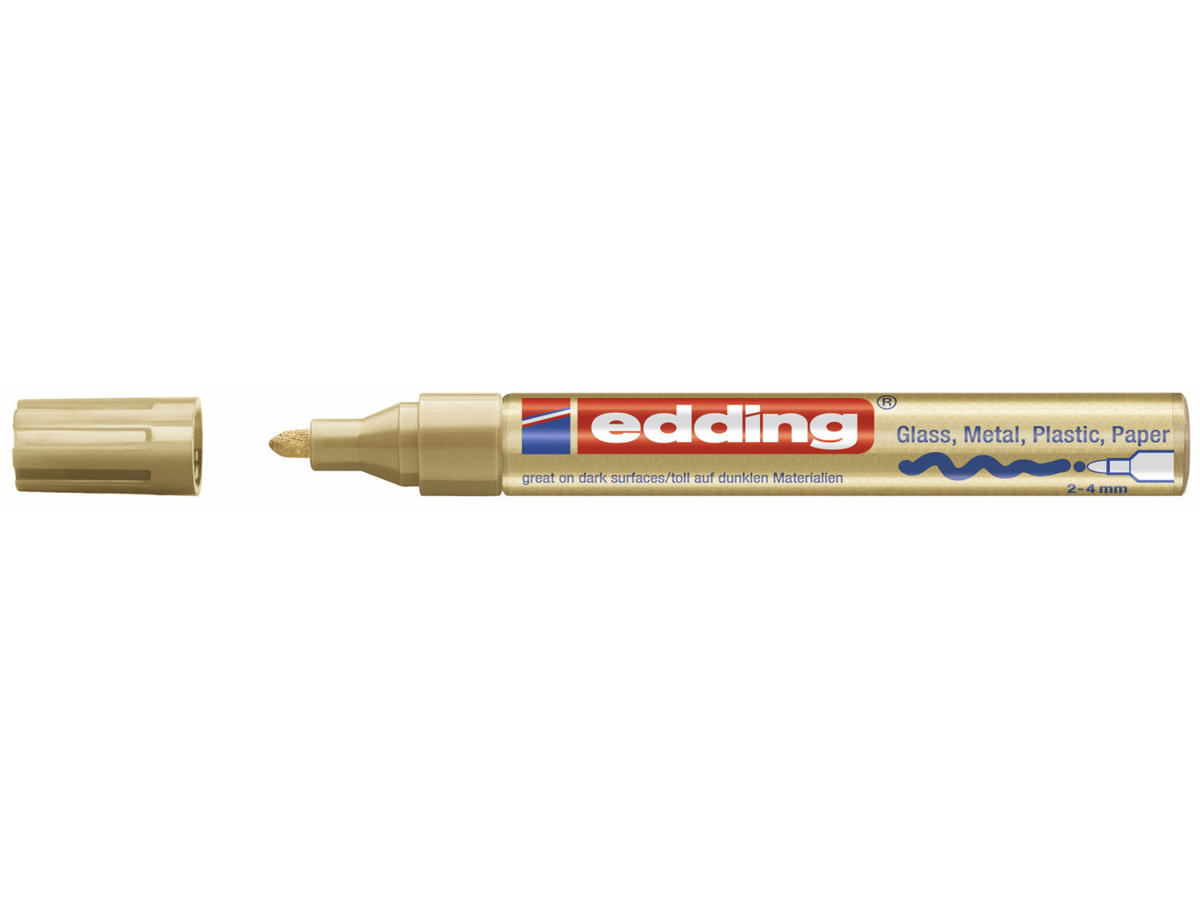Udstyr dig selv med edding 750 Paintmarker guld - en uundværlig allieret for permanent markering på en lang række overflader. Denne markør er perfekt til brug på materialer såsom metal, træ, glas, plast eller læder.
