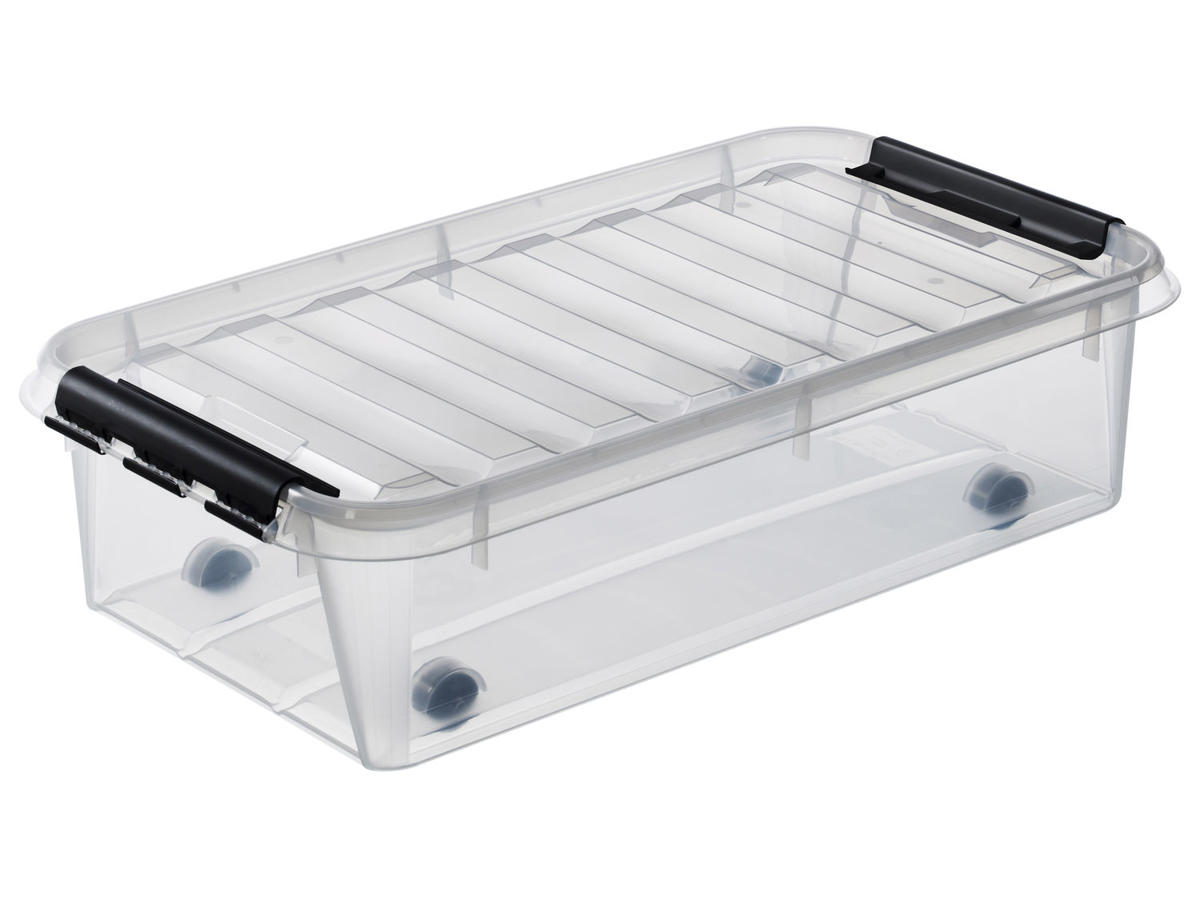 Plastkasse med låg og hjul.