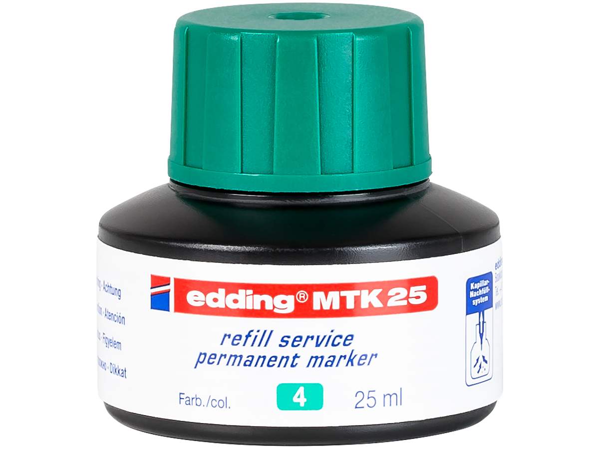 Denne grønne refill til permanent edding-tusch er nem at anvende - det tager blot en time at genopfylde din tusch, hvilket gør den klar til brug igen. Med denne refill-flaske er det nemt at fortsætte dit arbejde uden unødige afbrydelser.