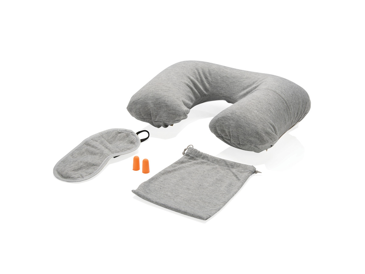 Jersey rejsesæt med lommer til mobiltelefonen eller hovedtelefoner. Blødt rejsesæt bestående af oppustelig nakkepude, maske, bløde ørepropper og en blød pose med snørelukning.