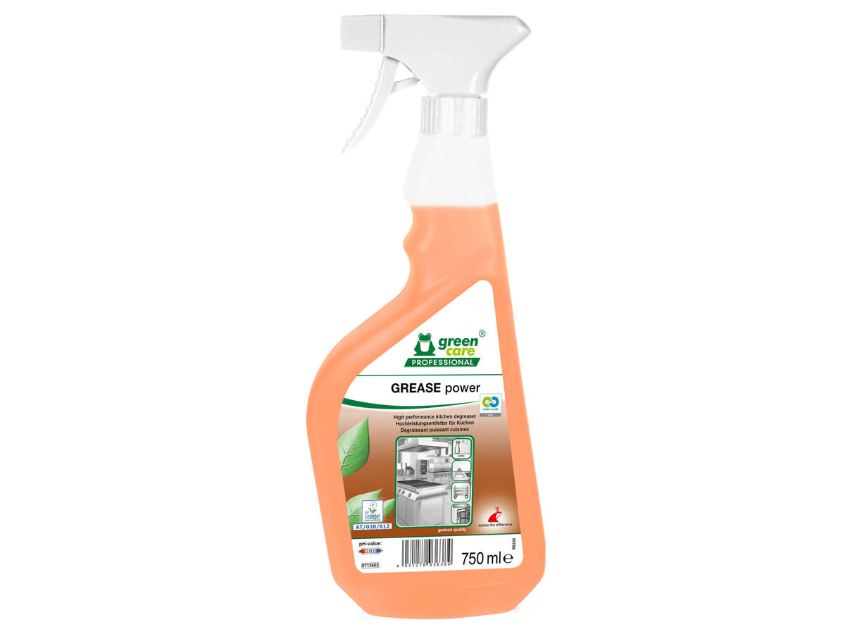 GREASE power fjerner nemt fedt fra alkalibestandige overflader uden at efterlade rester. GREASE power kan bruges på forskellige overflader og forskelligt udstyr og letter dermed arbejdet. GREASE power er nem at bruge og kan påføres manuelt og mekanisk (f.eks. med sprøjte eller skumpistol). Produktet forbedrer arbejdssikkerheden, samtidigt med at det giver yderst gode resultater på fastsiddende skorpedannelser. Velegnet til komfur og grill. GREASE power fås i en sprayflaske, der kan genfyldes. Produktet er hovedsageligt sammensat af fornybare materialer, og takket være det særlige koncept, som gør det velegnet til anvendelse i områder med fødevareforarbejdning, tager GREASE power ansvaret for fremtidige generationer.