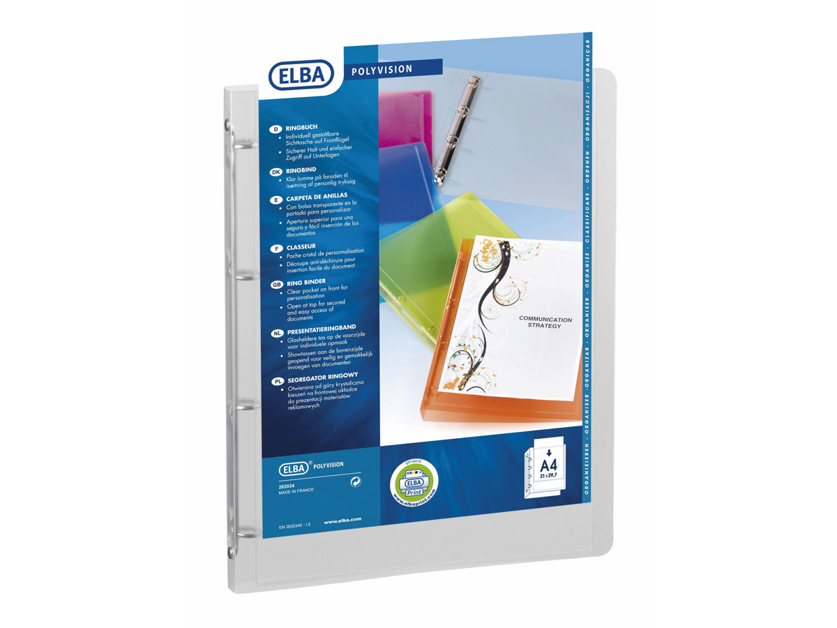 Smart ringbind fremstillet i transparent, farvet PP-folie med klar lomme på forsiden. Tilpasses nemt og hurtigt med personlig forside. Ideel til projekter, opgaver, præsentationer m.m.. 4 (20 mm) D-ringe mekanisme. Leveres uden rygetiket. Rygbredde : 30 mm, 170 A4 ark kapacitet (80g)