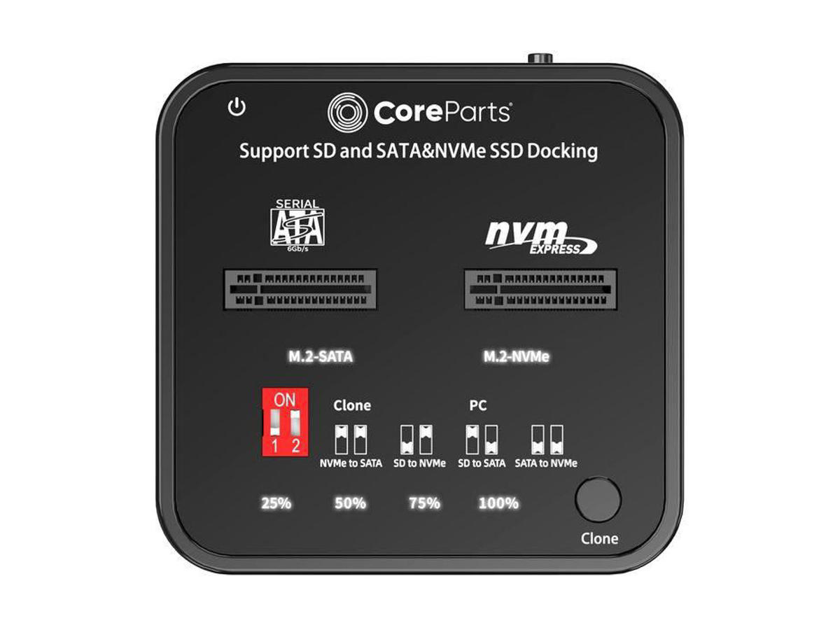 SATA/NVMe M.2-dockingstationen med dobbelt slot med klonfunktion muliggør nem installation af to M.2 SSD'er, der skal forbindes via det medfølgende Type C-kabel til pc'en eller laptoppen.