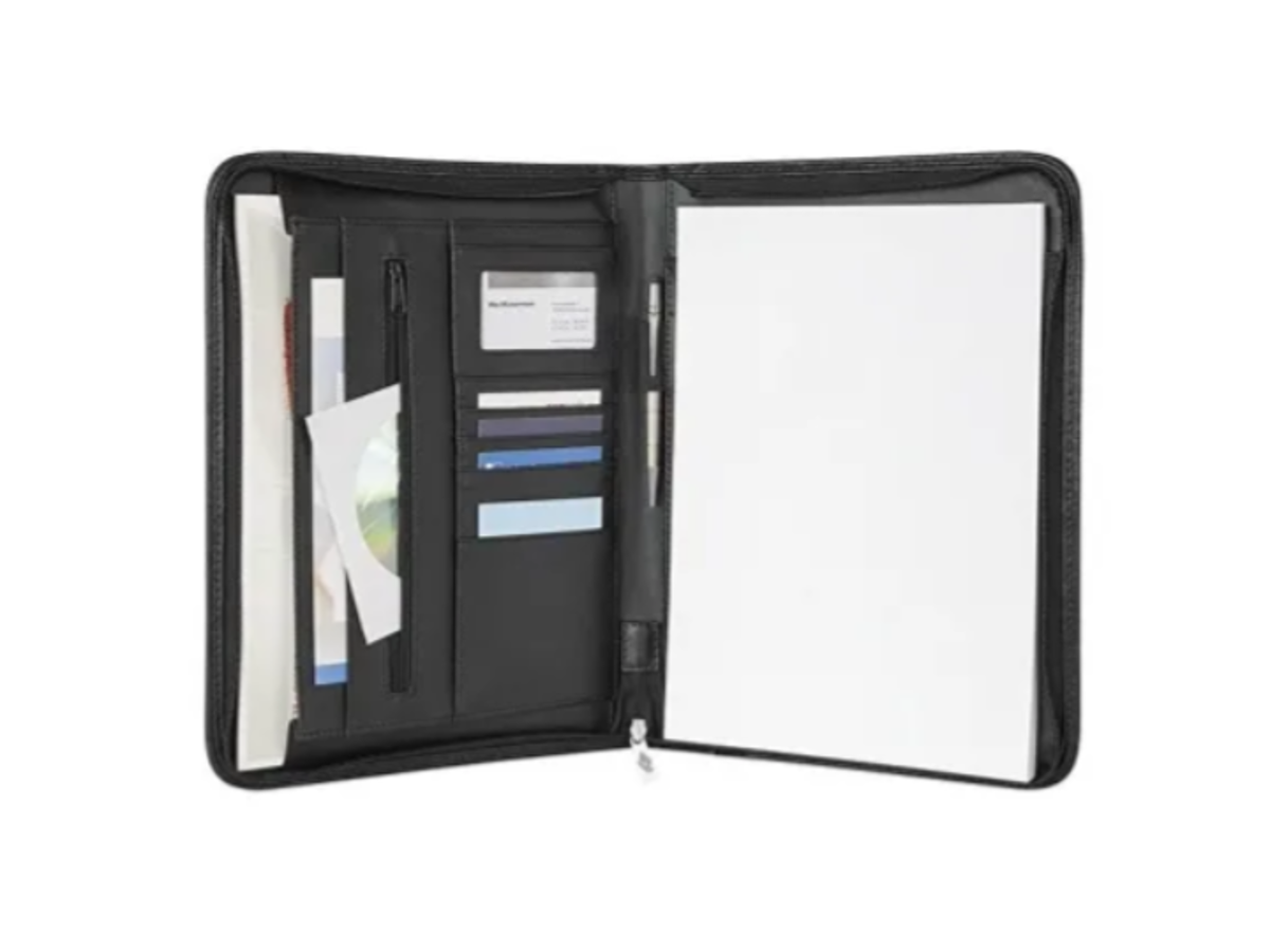Elegant konferencemappe i sort nylon/læder fra mærket WEDO i størrelsen A4. Mappen har plads til alt det nødvendige til en konference, der er lommer til visitkort og notepair, huskelister m.m