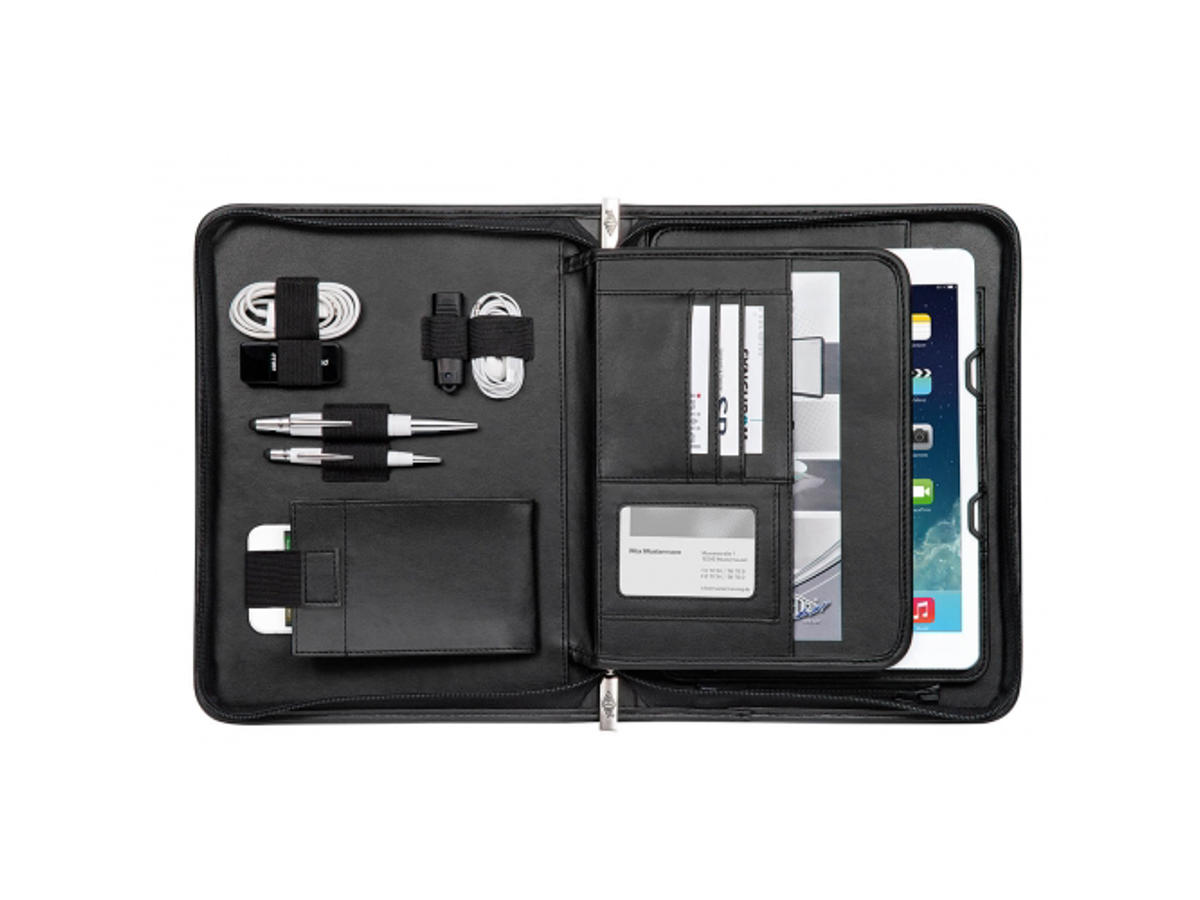 Universal organizer i kunstlæder med multifunktionelle egenskaber inklusiv aftagelig holder til iPad