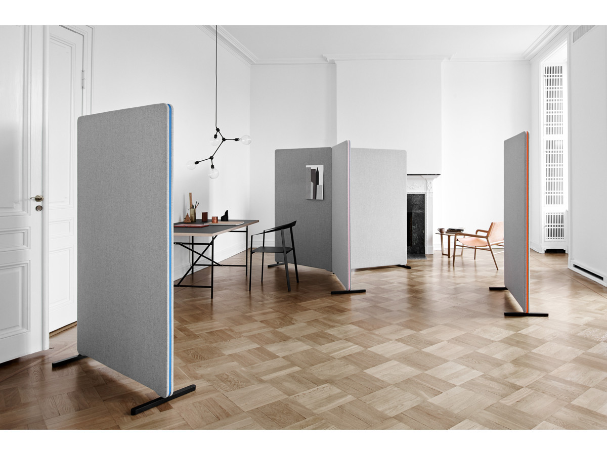 En moderne gulvskærm med rent design og lydabsorberende egenskaber. Både kantlisten af gummi og matrialet Fiji stof kan fåes i mange forskellige farver, hvilket giver store valgmuligheder.