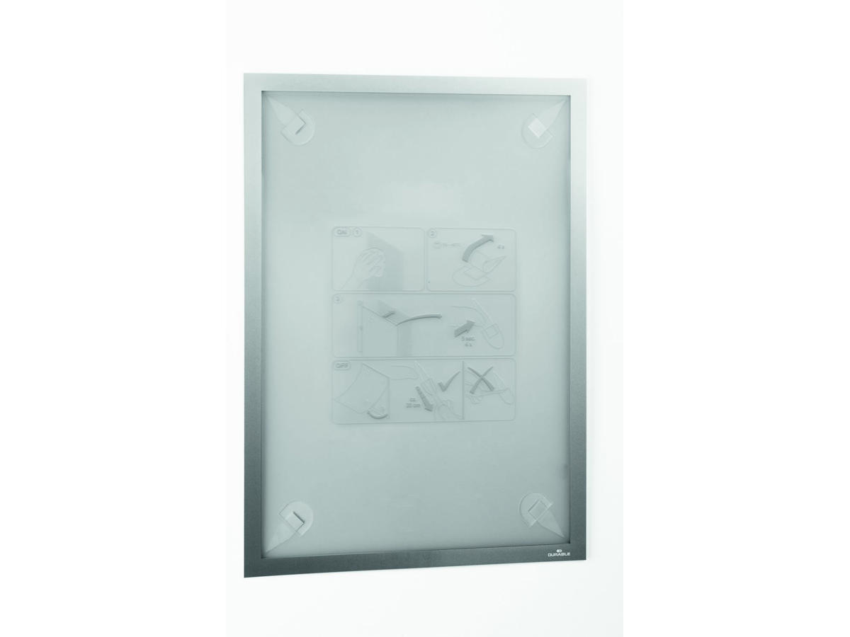 DURAFRAME® WALLPAPER A3 informationsskilt til at sætte på tapet, plastoverflader eller træ med strips, med magnetisk ramme i sølv.