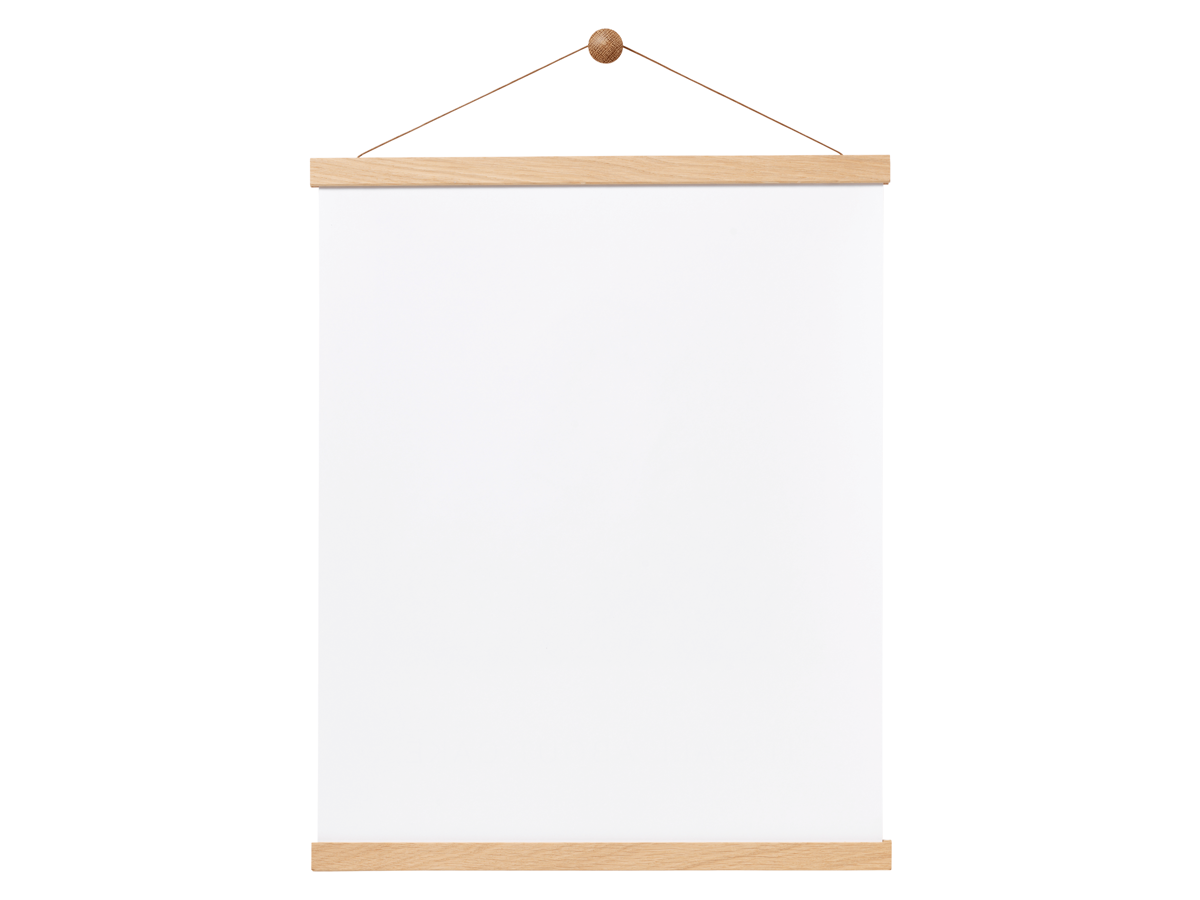 Magnet rammeskinne sæt i natur egetræ, længde 41 cm. Sættet består af 2 skinner, med indbyggede magneter, så man nemt kan hænge plakater, tegninger, billeder m.v. op. Sæt plakaten ind mellem de 2 skinner, og luk skinnerne sammen, enkelt og let. Magneterne sikrer, at plakaten sidder godt fast, men er nem at udskifte.