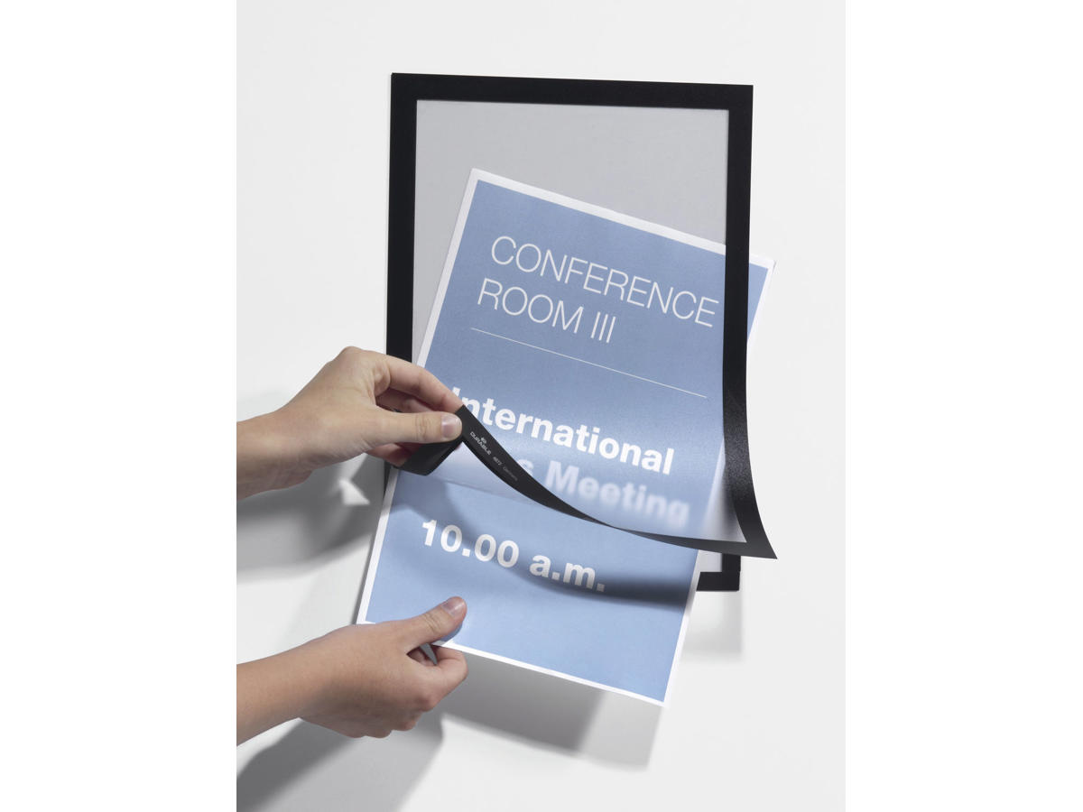 DURAFRAME® er den professionelle og bekvemme måde at vise informationer. Du skal blot fjerne det beskyttende papir og placere den selvklæbende bagside på enhver glat, fast overflade såsom vinduer, arkivskabe og døre.