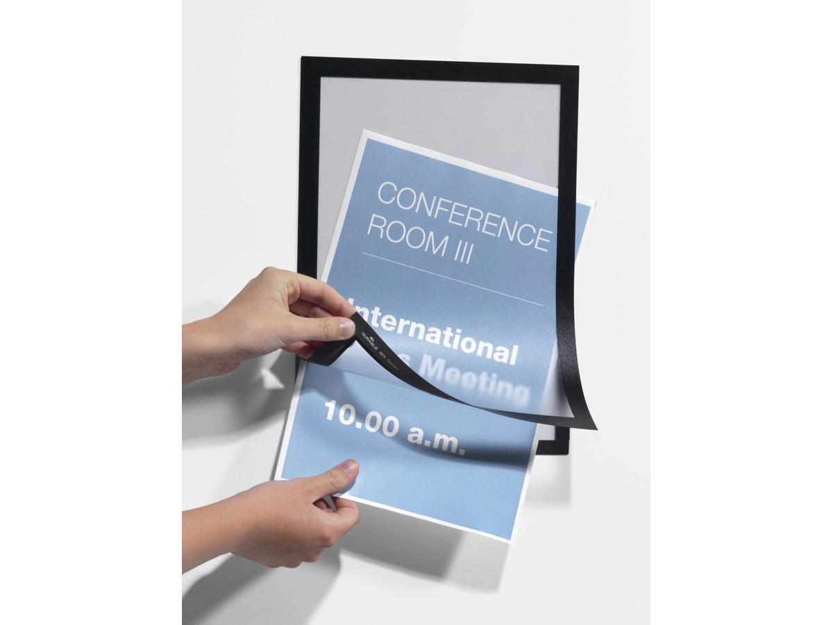 DURAFRAME® er den professionelle og bekvemme måde at vise informationer. Du skal blot fjerne det beskyttende papir og placere den selvklæbende bagside på enhver glat, fast overflade såsom vinduer, arkivskabe og døre.