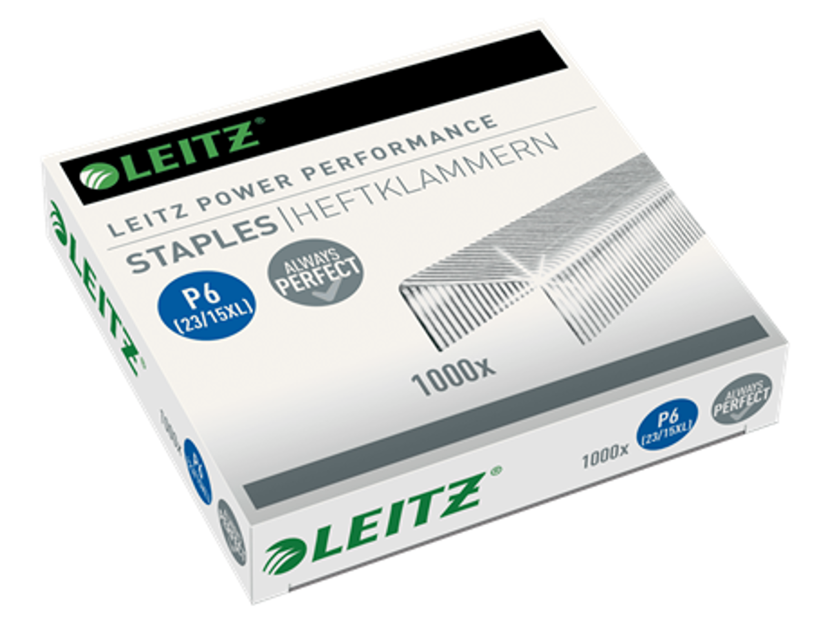 Hæftemaskinen leveres med 1.000 23/15XL hæfteklammer, der sikrer knivskarpe hæfteresultater hver gang. De stærke stålhæfteklammer med 15 mm benlængde er designet til Leitz Power Performance P6, og sikrer en driftssikker hæftning, selv under de mest krævende forhold.