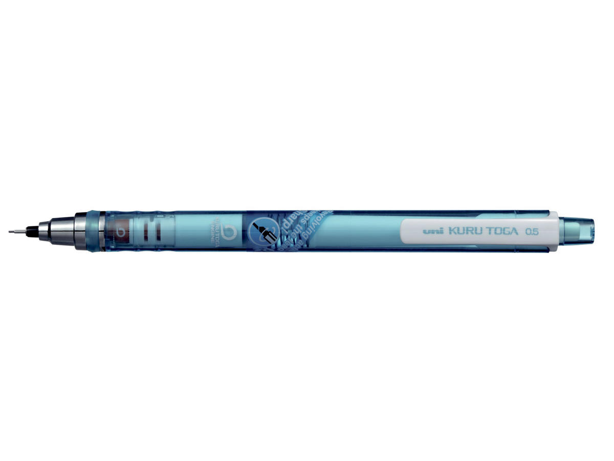 Uni-balls Kuru Toga stilfulde pencil er bogstaveligt talt en revolution inden for mekaniske blyanter. Med et 3-gears rotationsmekanisme roterer minen, hver gang den løftes fra papiret. Dette sikrer minen altid er spids og forhindrer den i at smuldre eller knække.