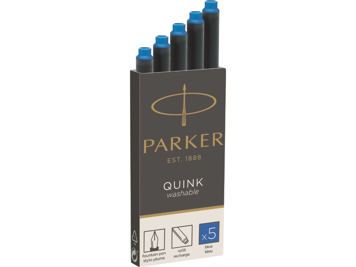Denne pakke indeholder 5 refills med Parkers klassiske blå Quink blæk, kendt for sin flydende skriveoplevelse og rige farve.