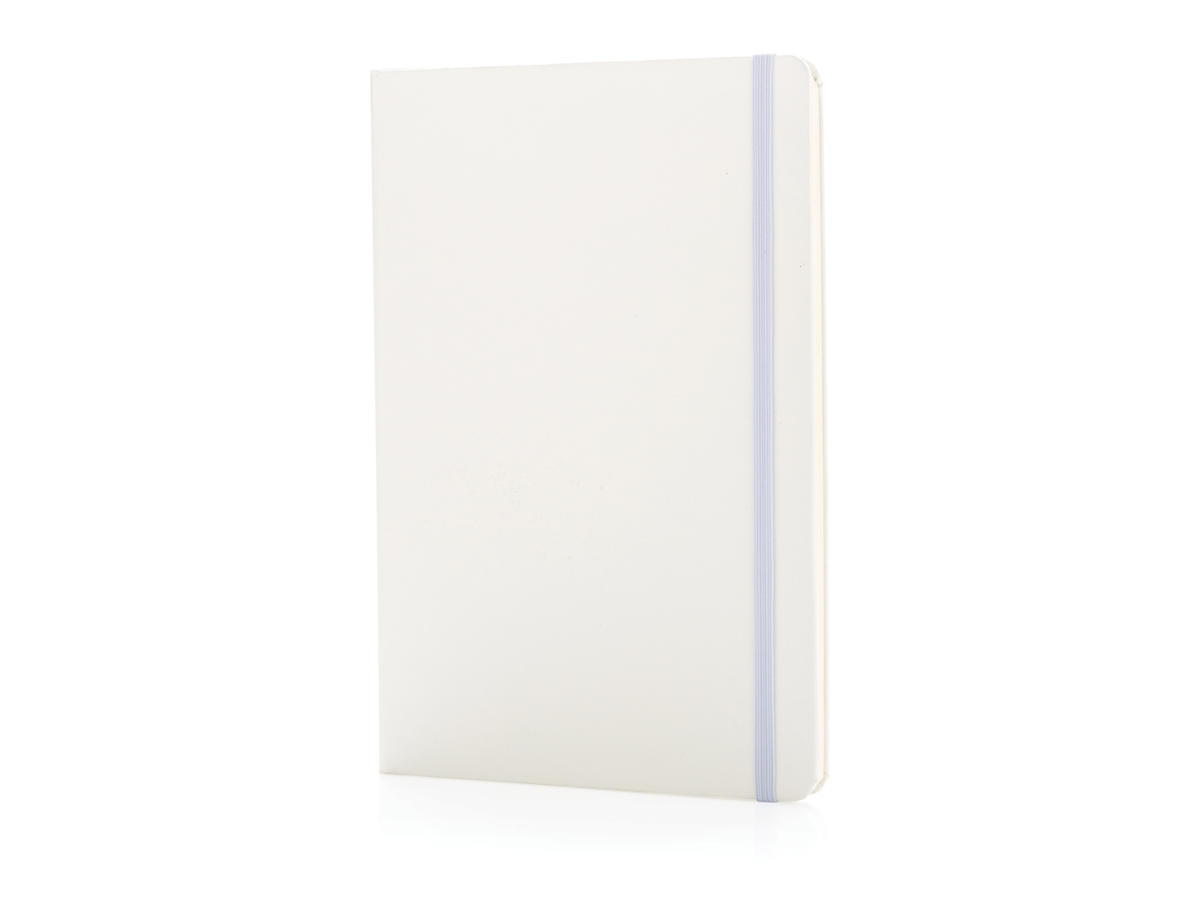 Blank sidet A5 hardover notesbog med elastik lukning samt bånd ti sideadskillelse. 72 siders 70g/m2 cremefarvet papir.