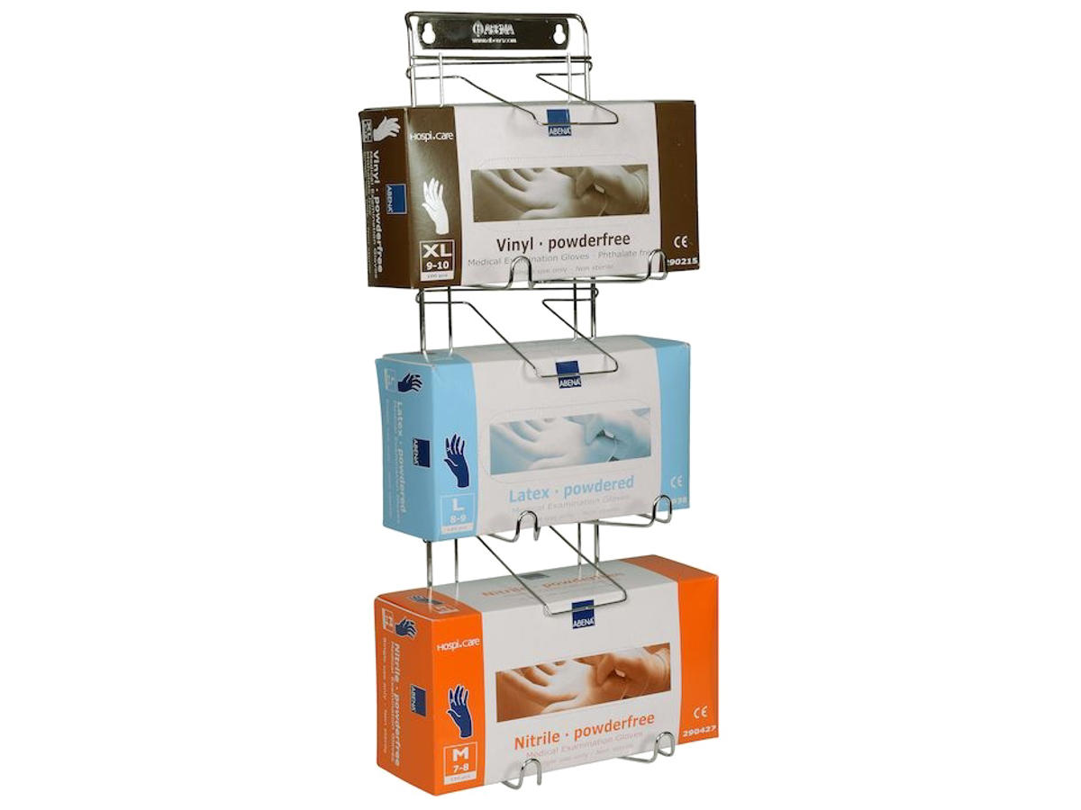 Handskestativ i rustfrit stål der kan holde op til 3 æsker. Stativet passer også til ansigtsservietter eller forklæder i æske dispensere.