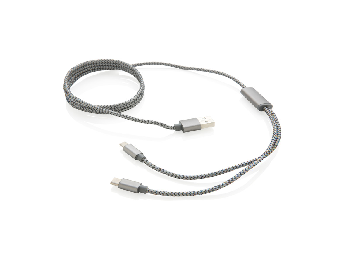 Luksus flettet 3 i 1 kabel med type C og dobbeltsidet stik til iOS og Android enheder, der kræver micro USB. Kabel flettet med nylonmateriale med stik af holdbart aluminium. Velegnet til opladning. Længde 120 cm.