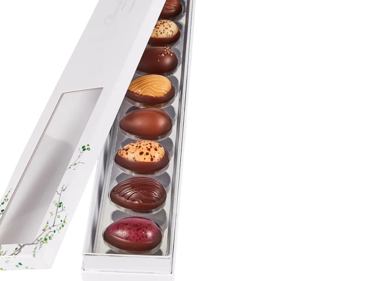 Smuk og elegant gaveæske, fyldt med 9 forskellige varianter af vores raffinerede økologiske påskeæg.