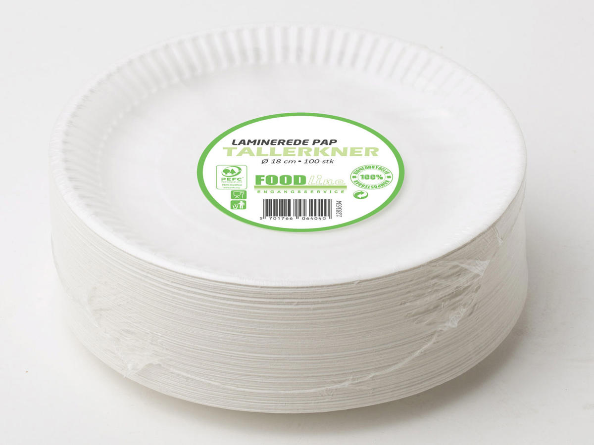 Engangstallerken fra FoodLine. Produceret af PEFC mærket karton.