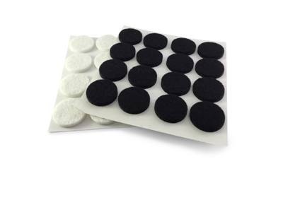 Filt-/klæbepuder kan bruges til at hænge ting op, beskytte gulve for skader fra møbler og dæmpe lyd fra skab og andre genstande.