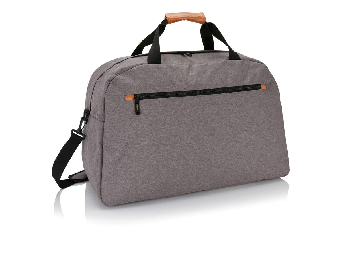 600D polyester-rejsetaske i to nuancer med moderigtige brune detaljer på håndtag og lynlåse.