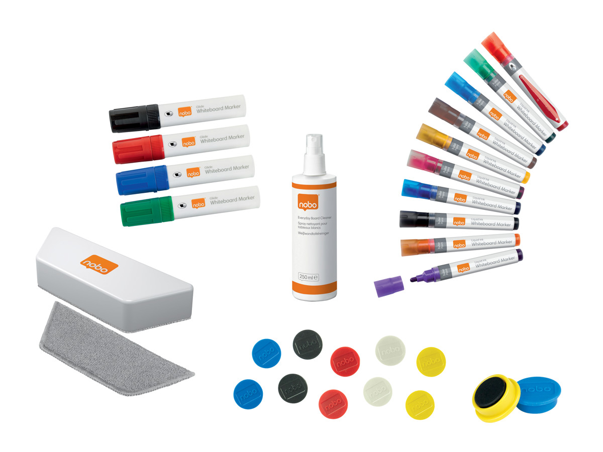 Nobo whiteboardtavle- sæt med tavlerens, markere og magneter.