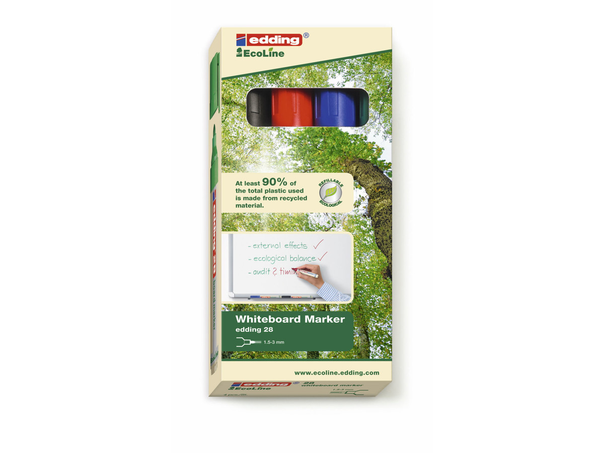 Ikke nok med at denne whiteboard markør er yderst praktisk, så er den også miljøvenlig. Mindst 90 % af plastikdelene er lavet af genbrugsmateriale, hvoraf 83 % stammer fra post-consumer plast. Derudover kan Edding 28 Ecoline genopfyldes ved hjælp af edding BTK 25 refill blæk.