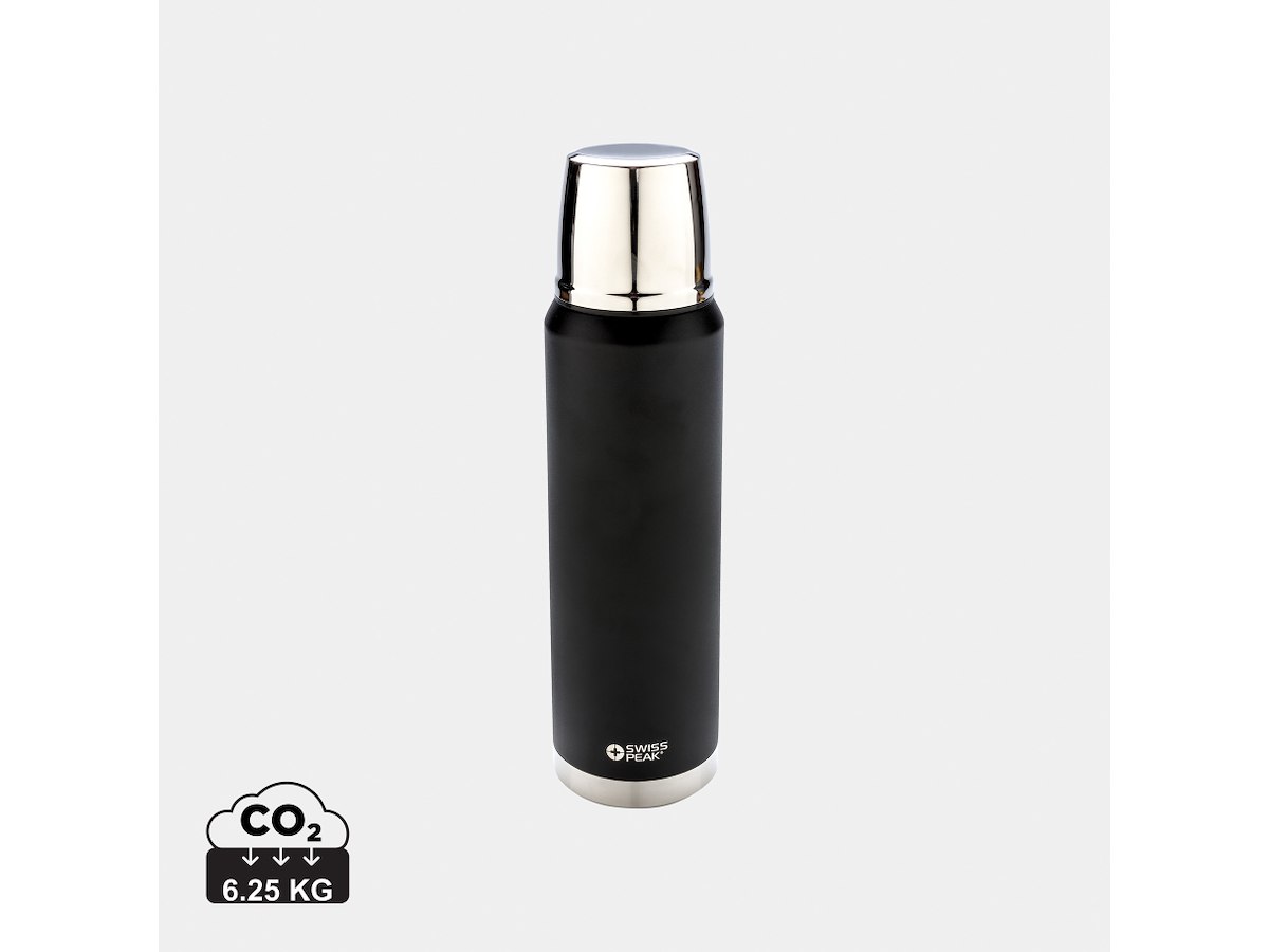 Swiss Peak Elite serien er med dobbeltvægget vakuum isoleret type 18/8 rustfrit stål. Den sorte pulver coatede farve er super stærk for lang holdbarhed. Ingen misfarvning eller revner. Indervæggen er kobberbelagt for optimal varmeegenskaber og kan holde varmt i op til 8 timer og koldt i op til 24 timer. Kun til håndvask. Indhold 1.000ml.