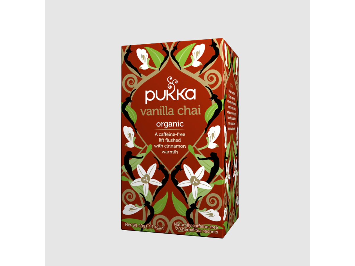 Koffeinfri vanilje-chai med søde, varmende urter. Ren nydelse. Indeholder en blanding af seks økologiske fairtrade-urter fra små, selvstændige landmænd fra hele verden. Hver ingrediens er kendt for at bidrage til at gøre livet lidt sødere.
