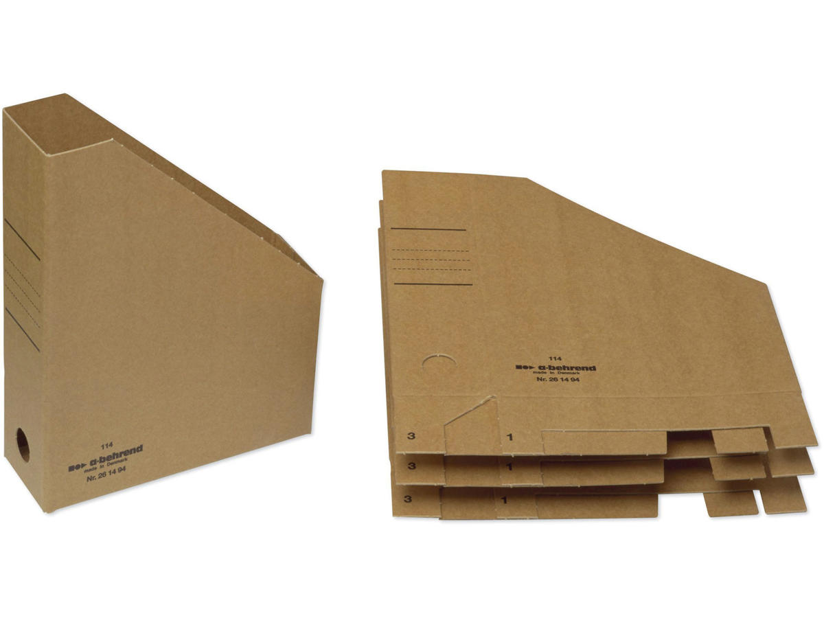 Tidsskriftskassetter produceret i kraftig massiv brun karton. Forsynet med fingerhul og påtrykt rygetiket på for- og bagside.
