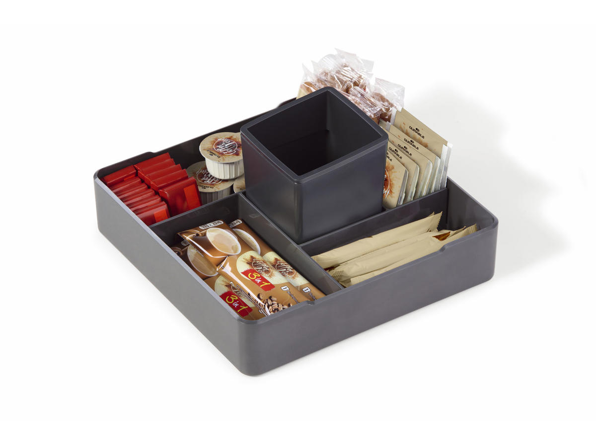 Kasse til opbevaring af kaffe og te tilbehør f. eks sukker pinde, omrører, servietter, kaffe fløde og kager i de enkelte pakning, chokoladebarer og tebreve. Med plads til mini affaldsbeholder (varenr. 394132). Godkendt til fødevarekontakt og tåler maskinopvask. Kan stables. Passer i opbevaringsboks Coffee Point Box (varenr. 394130). Mål: HxWxD 48x210x210mm.