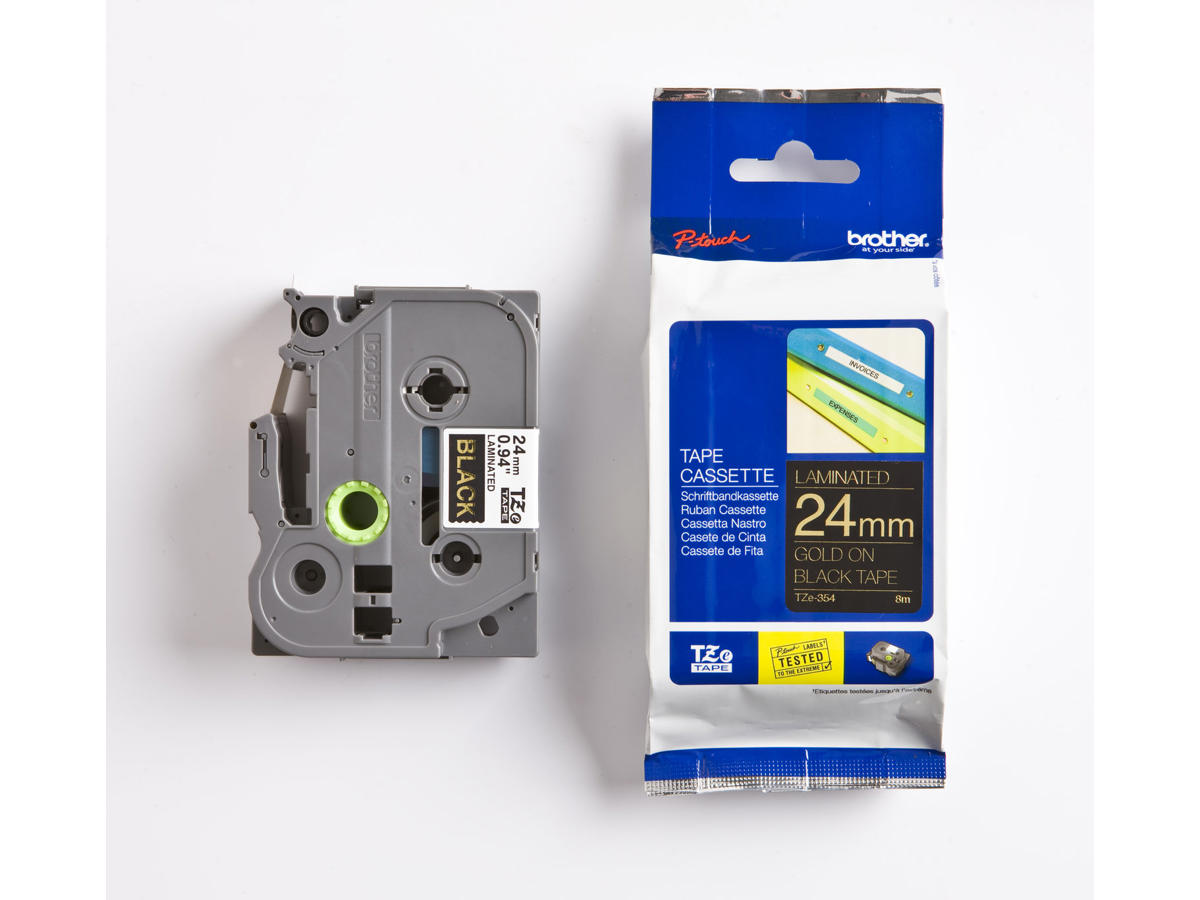 Med Brother TZe-tape får du en komplet løsning til alle dine etiketteringsbehov. Uanset om du administrerer en stor virksomhed eller simpelthen har brug for at organisere dit hjem, er Brother TZe-tape 24mm x 8m, med guld tekst på sort tape, det eneste valg, hvis din mærkning skal være læsbar under alle forhold.