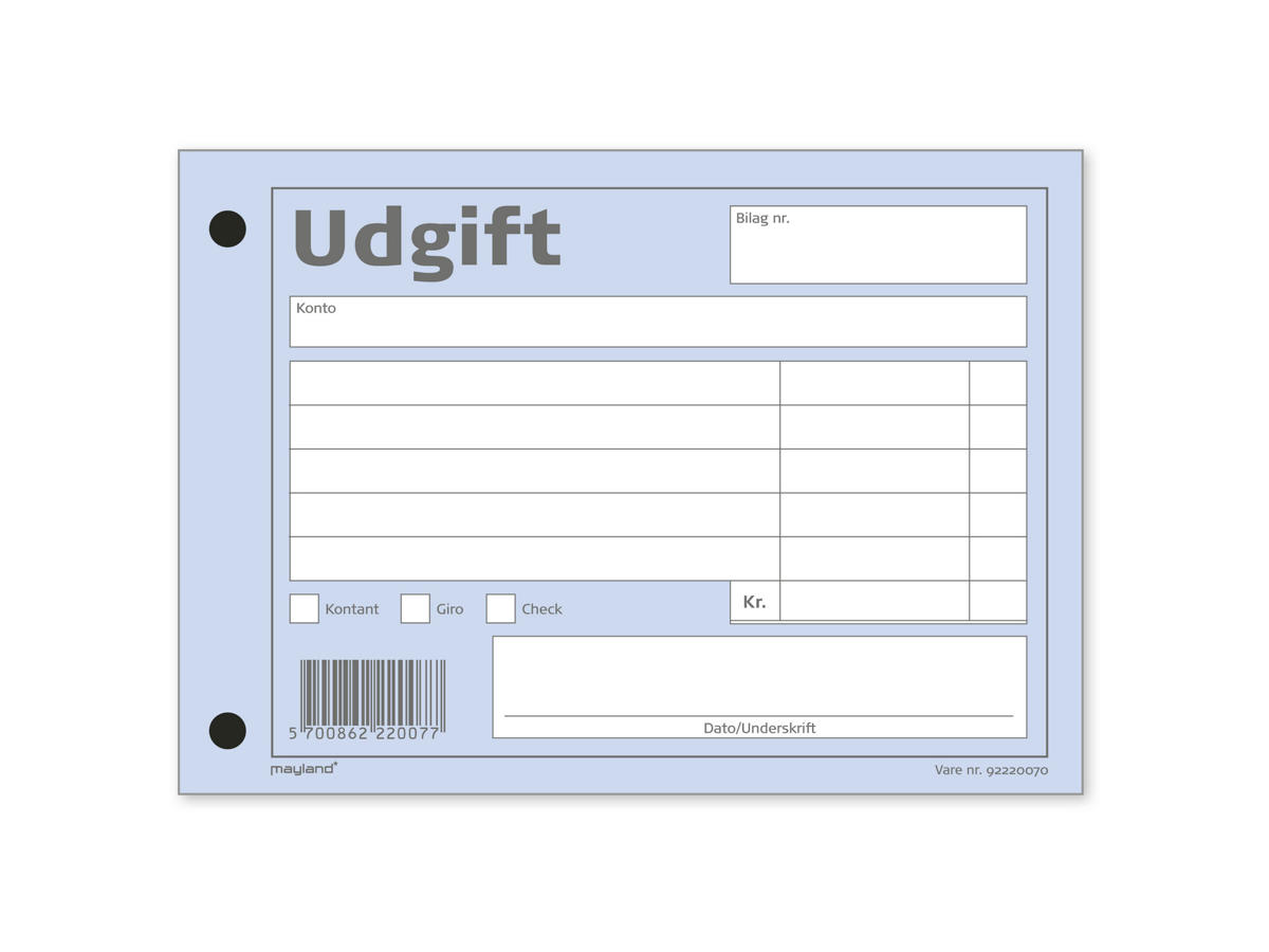 Hold styr på virksomhedens økonomi med vores udgiftsbilag i en praktisk limet blok med 100 afrivningsblade. Hvert bilag er designet med tydelige felter til udfyldning af konto, dato, beløb og nummerering, hvilket gør det nemt at registrere og organisere indtægter. Dette produkt er ideelt for virksomheder, der ønsker at have en fysisk oversigt over deres økonomiske posteringer.