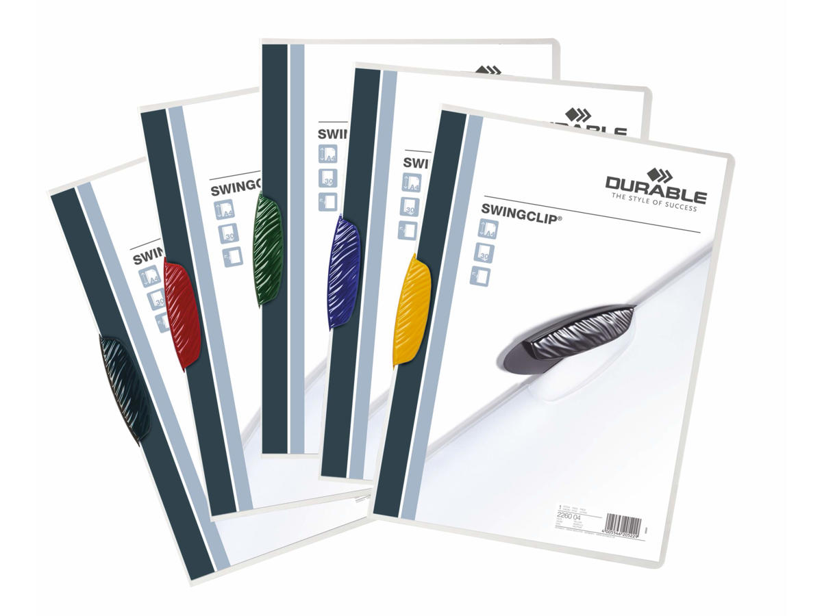 Den slidstærke SWINGCLIP® er lavet af gennemskinneligt, refleksfrit og rivefast polypropylen. Én mappe kan sikkert holde og beskytte 1-30 ark A4-papir. Ideel til dokumenter i A4-format, f.eks. tilbud, mødedokumenter og undervisningsmateriale. Der er ingen grund til at lave huller eller hæfte dine dokumenter, du skal blot svinge klemmen ud, indsætte dine dokumenter og lukke klemmen.