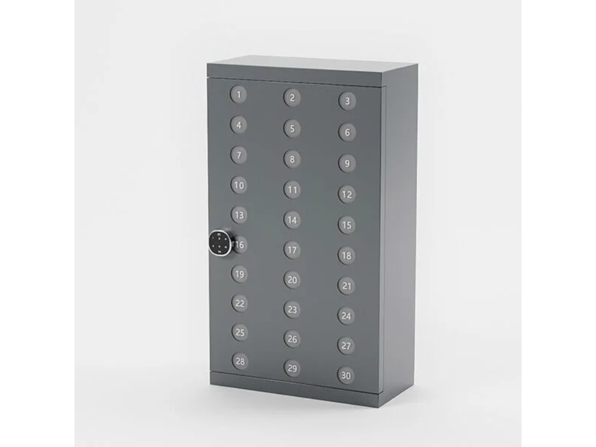 Denne model er i stål med kodelås. Skabet har 30 rum med plads til mobiltelefoner.