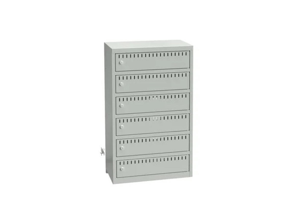 Dette opladningsskab (vægmodel) med 6 rum i højden er designet til cykelbatterier. Skabet er med lige tag. Åbningsmål pr. rum 540x280x140 mm (bxdxh).