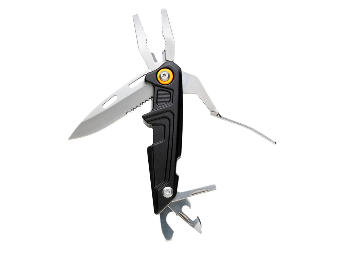 Ultrastærkt værktøj med 10 separate funktioner og 9 ekstra bits. Pakket i luksusgaveæske inklusive 1680D etui i høj kvalitet. Aluminiumskabinet og værktøj i rustfrit stål. Inkluderede værktøjer: spidstang, standardtang, ledningsskærer, kniv, savtakket klinke, dåseåbner, oplukker, flad skruetrækker, skruetrækker-bitadapter, 9-i-1 skruetrækkerbitsæt.